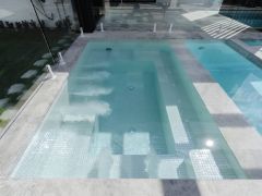Fagyálló, saválló, UV álló kültéri medence mozaik burkolatok. A medence burkolata klasszikusan a mozaikburkolat. A mozaikburkolat előnye a határtalan variálhatóság színek területén, felületi csillogás vagy matt felülettel rendelkező mozaikokról szólva éppen, a kőhatás megjelenítése mozaikokból... A mozaik medence burkolatok területén népszerűségi előnyt élveznek a prémium csillogós mozaikok 2025-ben is. Nagyon népszerűek a csillámos fugák amelyek nagymértékben megnöveli a medence mozaikburkolat exkluzivitását, hiszen a kültéri medencék burkolatai sok esetben fürdőznek a napsugarak ölelésében, amelyben az ezüstösen vagy aranyosan csillogó csillámocskák a fugában is kapnak bőven főszerepet, tündöklést a nap fényében. A kék medence mozaik mindig is jó döntés volt, mivel egyöntetű a víz kéksége, ezáltal szerepe a kék mozaiknak a medencében. De a fehér mozaik vagy éppen a bézs vagy szürke mozaik egy különleges türkiz medence vízszínnel ajándékozza meg a medencézés szerelmeseit. Minél mélyebb-nagyobb a vízoszlop magasság a medencében, annál sötétebb a víz színtónusa. Ez puszta fizika nem több, a felhők színei ebben nem játszanak közre.